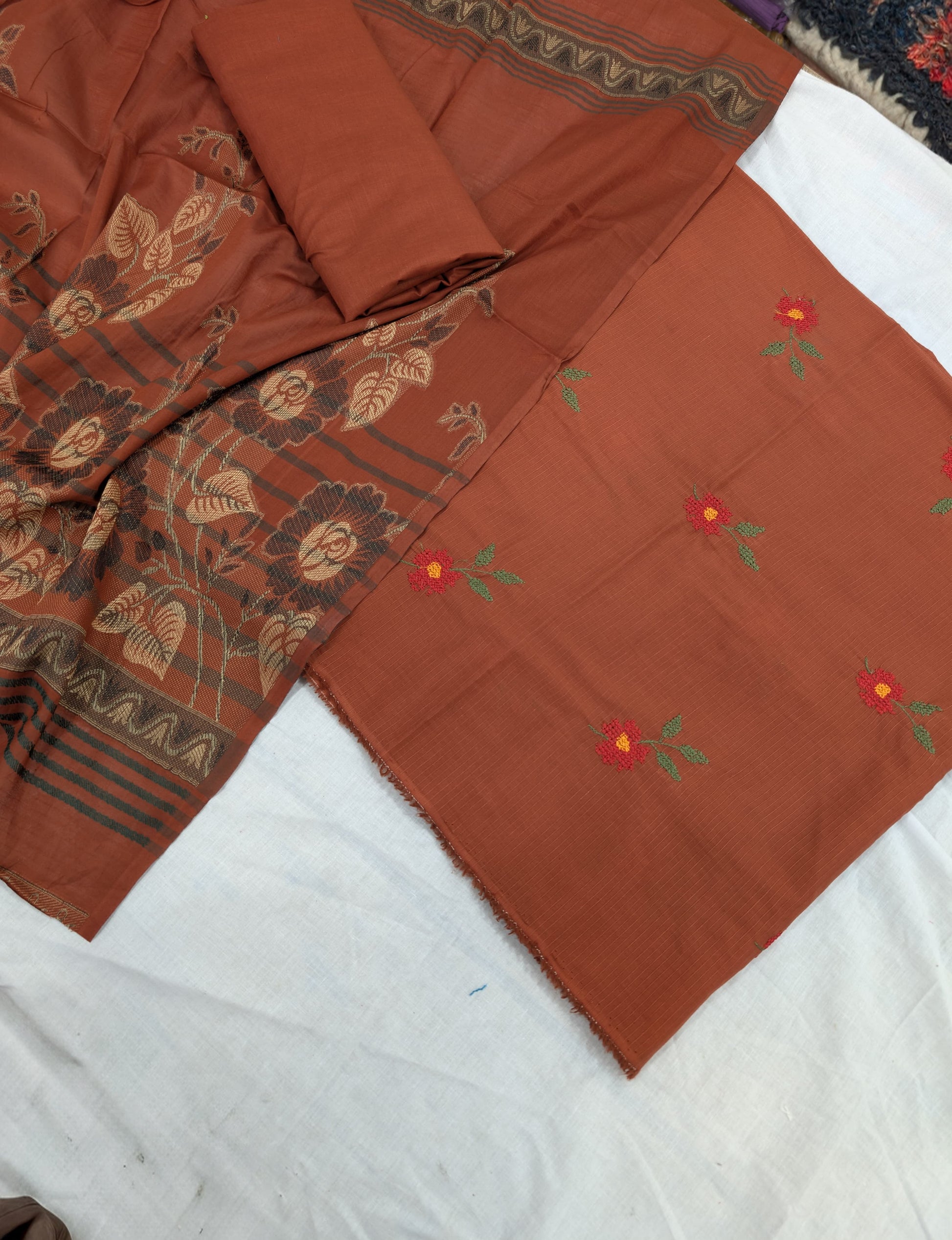 3PC BANA DORA EMBROIDED LAWN WITH BANARSI JAQUARD LAWN DUPATA PREMIUM QUALITY SUMMER COLLECTION (RUST COLOR)